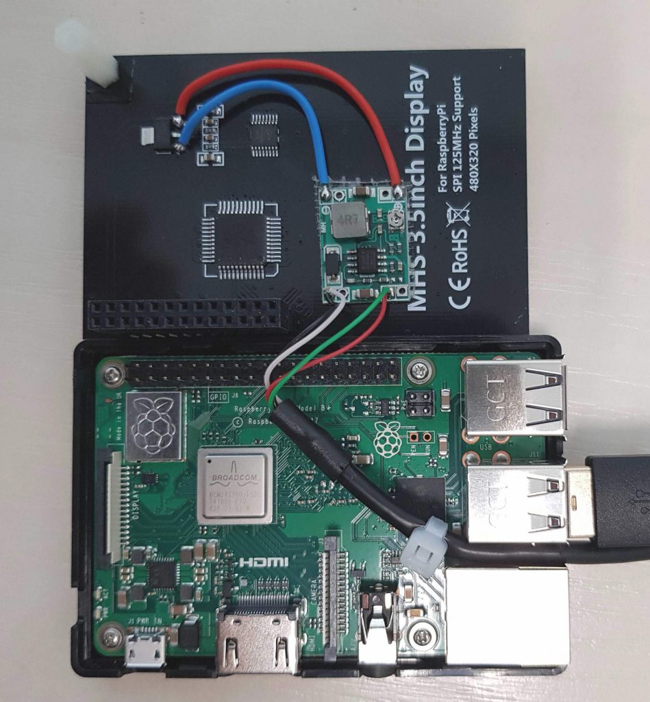 The machine 12V power supply is powerful enough to power the Raspberry Pi. Again, a little MP1584 will do the job. It fits into the raspberry case, behind the screen. To simplify wiring, it is better to power the raspberry via the screen.
