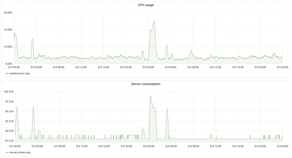 First, we wanted to find a correlation between CPU usage and power consumption for our servers. And it definitely looked like one! With around 500 000 datapoints (a piece of cake for Warp 10), we got an affine correlation. But more importantly: we found that each server consumes approximately 77 watts of power by just being powered on. In France, for one year of usage, that’s approximately €100 each.